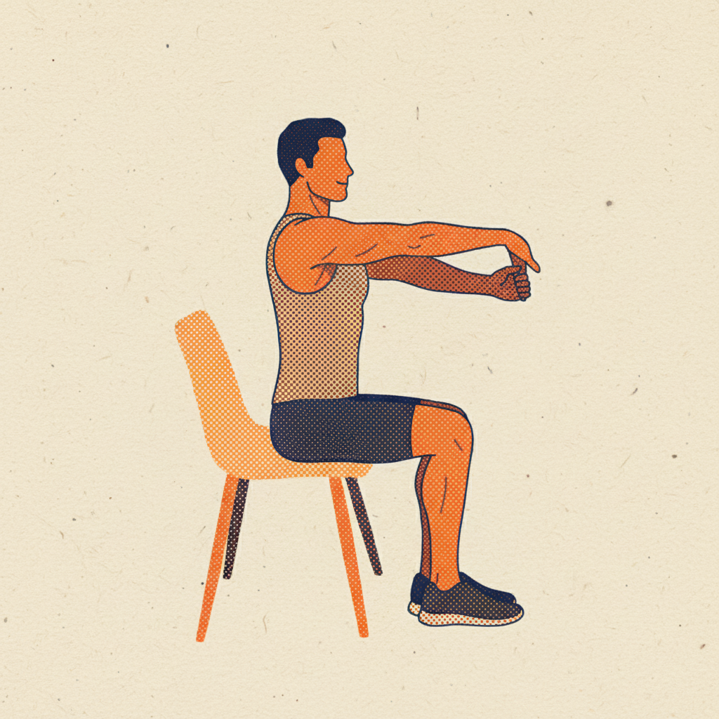 Sit up straight with your arms relaxed at your sides. Extend one arm in front of you, palm facing up. Gently pull your fingers back towards your body with your opposite hand. Feel the stretch in your forearm as you take a deep breath in. Exhale slowly, allowing your body to relax into the stretch. Inhale deeply again, feeling the gentle pull. Exhale, letting go of any tension. Continue breathing steadily, feeling the release with each breath. When you're ready, switch to the other side and repeat the stretch.