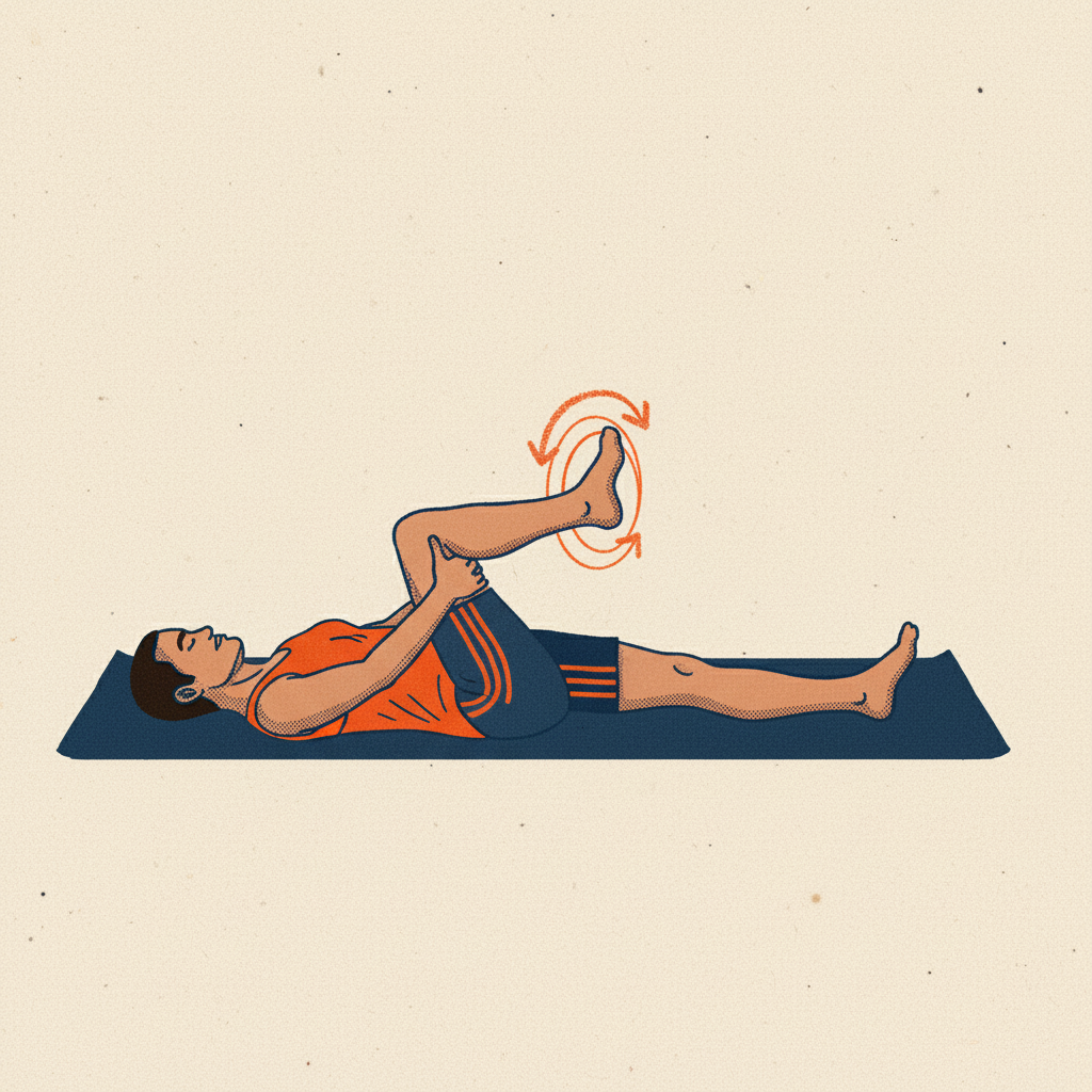 Lie on your back with your legs extended and arms relaxed at your sides. Bend one knee, drawing it gently toward your chest, and hold your thigh with both hands. Begin to rotate your foot in a smooth circular motion. After a few circles, switch directions. Keep your breath steady and relaxed, allowing your ankle to move freely. Feel the gentle stretch and mobility in your ankle with each rotation. When you're ready, slowly lower your foot back to the ground and switch to the other side.