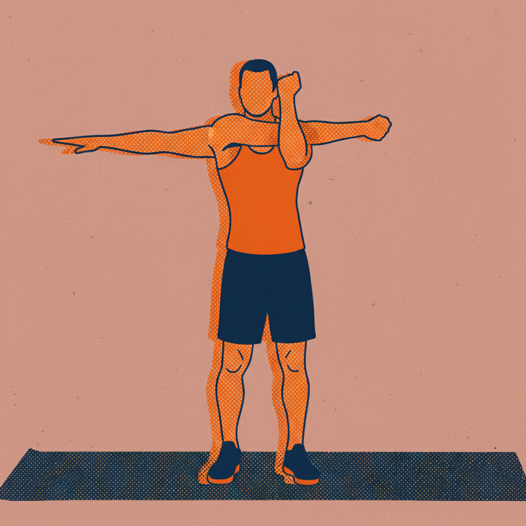 Stand tall with your back straight and arms relaxed at your sides. Extend one arm across your body towards the opposite shoulder. Gently hook your other arm around the extended arm, drawing it closer to your chest. Feel the stretch in your shoulder and lats as you breathe deeply. Inhale, expanding your chest, and exhale, allowing your body to relax into the stretch. Hold for a few breaths, noticing the release in tension. When you're ready, gently release the hug and switch to the other side.