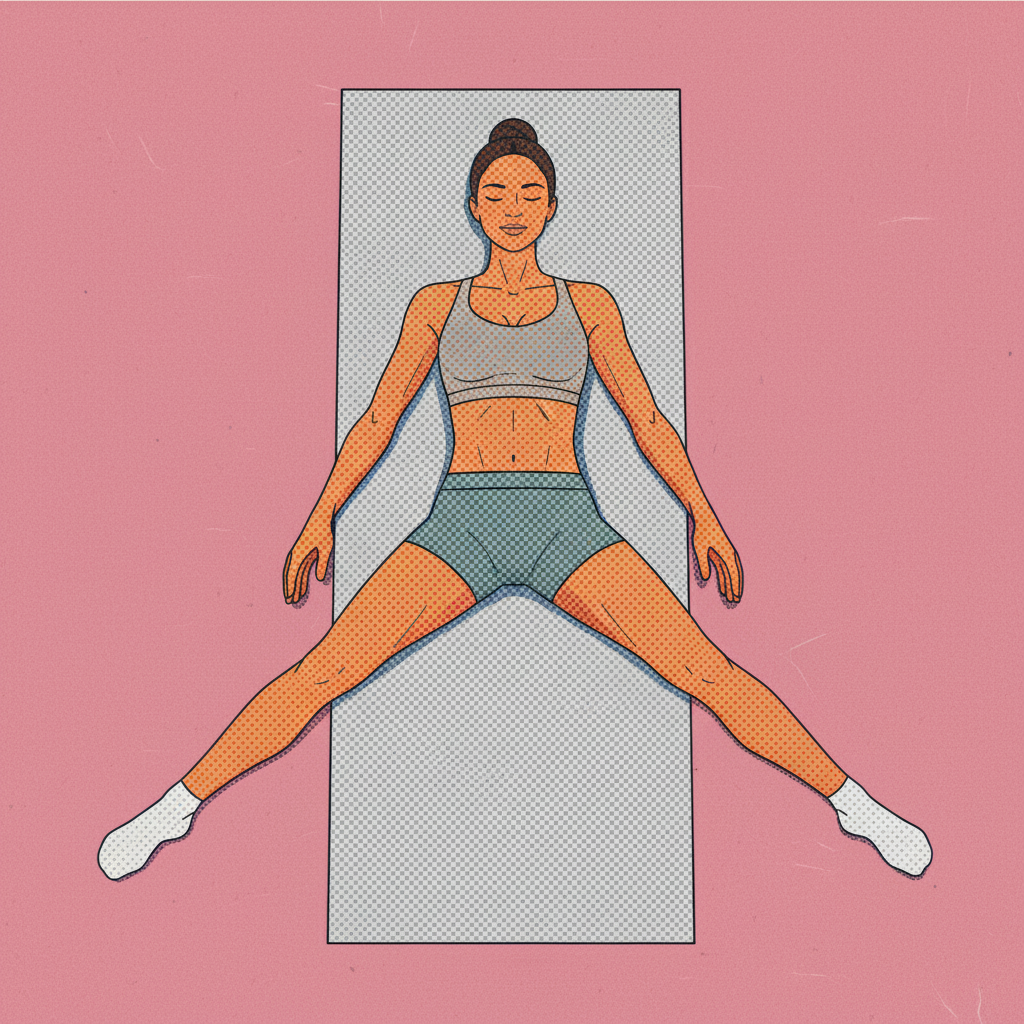 Lie on your back with your knees bent and feet flat on the floor. Widen your feet beyond shoulder-width, allowing your knees to gently fall towards each other. Feel the stretch in your hips and thighs as you breathe deeply. Inhale, expanding your chest, and exhale, letting go of any tension. With each breath, allow your knees to relax closer together, deepening the stretch. Stay present in this moment, feeling the release in your body. When you're ready, gently bring your knees back to a neutral position and prepare to transition.